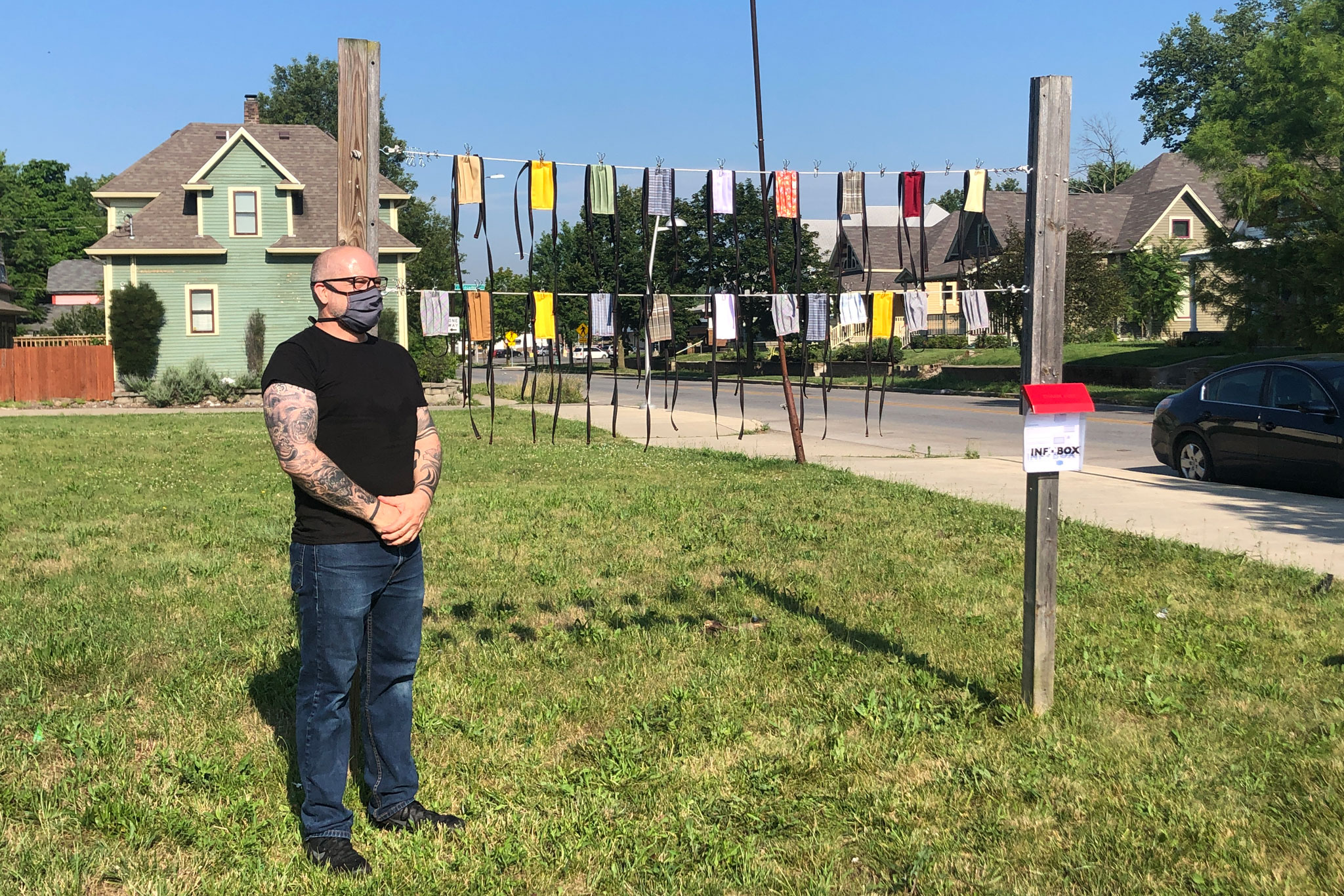 A few weeks ago, on 10th Street and Hamilton Avenue, Herron alum Philip Campbell (B.F.A. General Fine Arts '89) built a simple clothesline that gives residents of the Near Eastside free access to face masks in the midst of the COVID-19 pandemic.